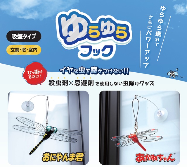 おにやんま君・あかねちゃんのストラップタイプにぴったりなグッズが登場です! ゆらゆら揺れることによってさらに効果を発揮♪ 玄関や窓、室内で使いやすい吸盤仕様! お好きな場所へ、ゆらゆらフックに付属の吸盤を付けてご使用ください。 (吸盤の取付が可能な場所にのみ取り付け可) ※おにやんま君・あかねちゃんは付属しておりません。 ※おにやんま君・あかねちゃん以外はぶら下げないでください。 ※他製品とご購入の場合はまとめての発送となります。ご了承ください。